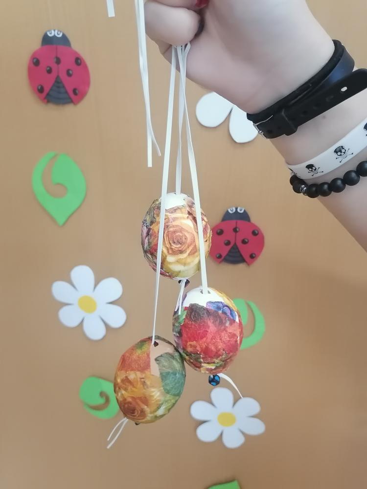 Vyzkoušely jsme ubrouskovou techniku, která nás všechny bavila. Hotové kraslice nyní zdobí vchod do školy a navozují příjemnou sváteční atmosféru.
